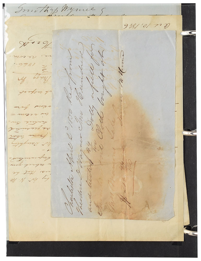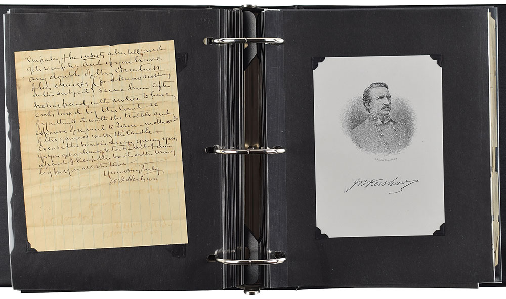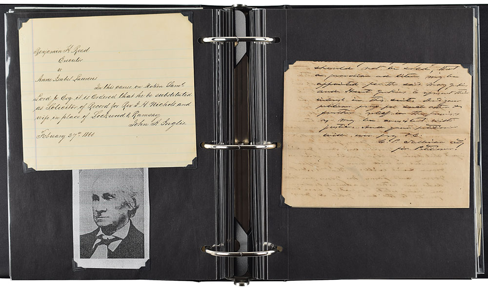 Other ephemera includes: three carte-de-visites of cartoons about Jefferson Davis; a five-dollar Confederate banknote; and an 1861 Confederate election ticket for Davis and Stephens. In overall very good to fine condition. From the collection of Dr. Lawrence E. Miller.