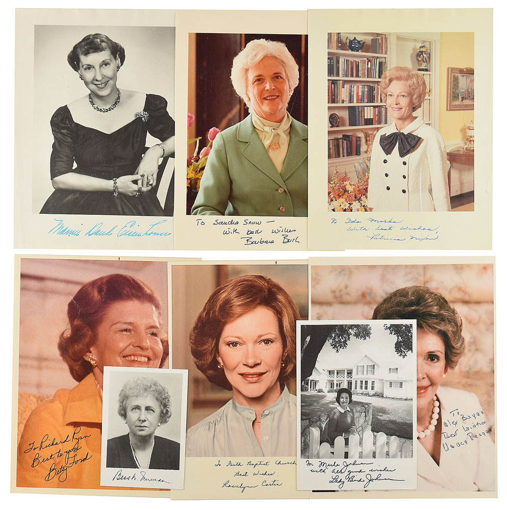 Group lot of eight photos of former first ladies, various finishes, ranging in size from 3.5 x 5 to 8 x 10, each signed in ink or felt tip by the pictured first lady, with six inscribed: Barbara Bush, Rosalynn Carter, Mamie Doud Eisenhower, Betty Ford, Lady Bird Johnson, Pat Nixon, Nancy Reagan, and Bess Truman. In overall fine condition, with light edge rippling to Pat and Mamie. From the collection of Dr. Lawrence E. Miller.