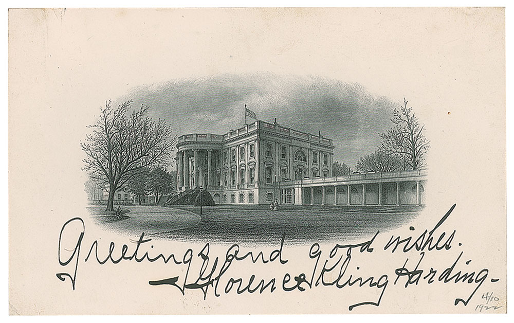 Attractive engraving of the South Portico of the White House, 6.5 x 4, signed in bold ink, "Greetings and good wishes, Florence Kling Harding." Small pencil notation to lower right dates the signature to April 10, 1922. In fine condition, with a faint paperclip impression to the top edge. From the collection of Dr. Lawrence E. Miller.