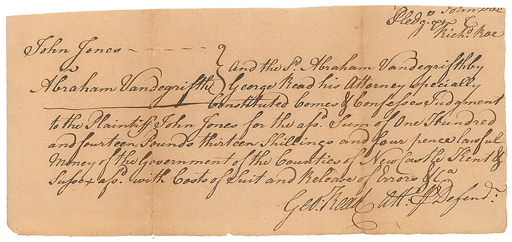 Signer of the Declaration of Independence from Delaware (1733-1798). Twice-signed ADS, signed "George Read" and “Geo: Read, Att'y P. Defend'r,” one page, 7.75 x 3.5, no date. Legal document, which reads: "John Jones…and the s'd Abraham Vandergrifth by George Read his Attorney specially Constituted Comes & Confesses Judgment to the Plaintiff John Jones for the ass'd Sum of 100 Hundred and fourteen Pounds thirteen Shillings and four pence lawful Money of the Government of the Counties of New Castle, Kent & Sussex ass'd with Costs of Suit and Release of Errors." Signed within the text and at the conclusion by Read. In very good to fine condition, with tape repairs on the back to two fold separations. From the collection of Dr. Lawrence E. Miller.