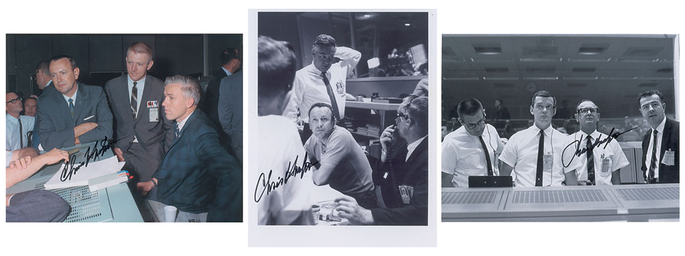 Three glossy photos of the director of the Manned Spacecraft Center, 10 x 8 and 8 x 10, each signed in black felt tip by Chris Kraft. In overall very fine condition.