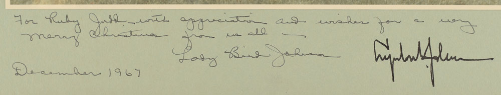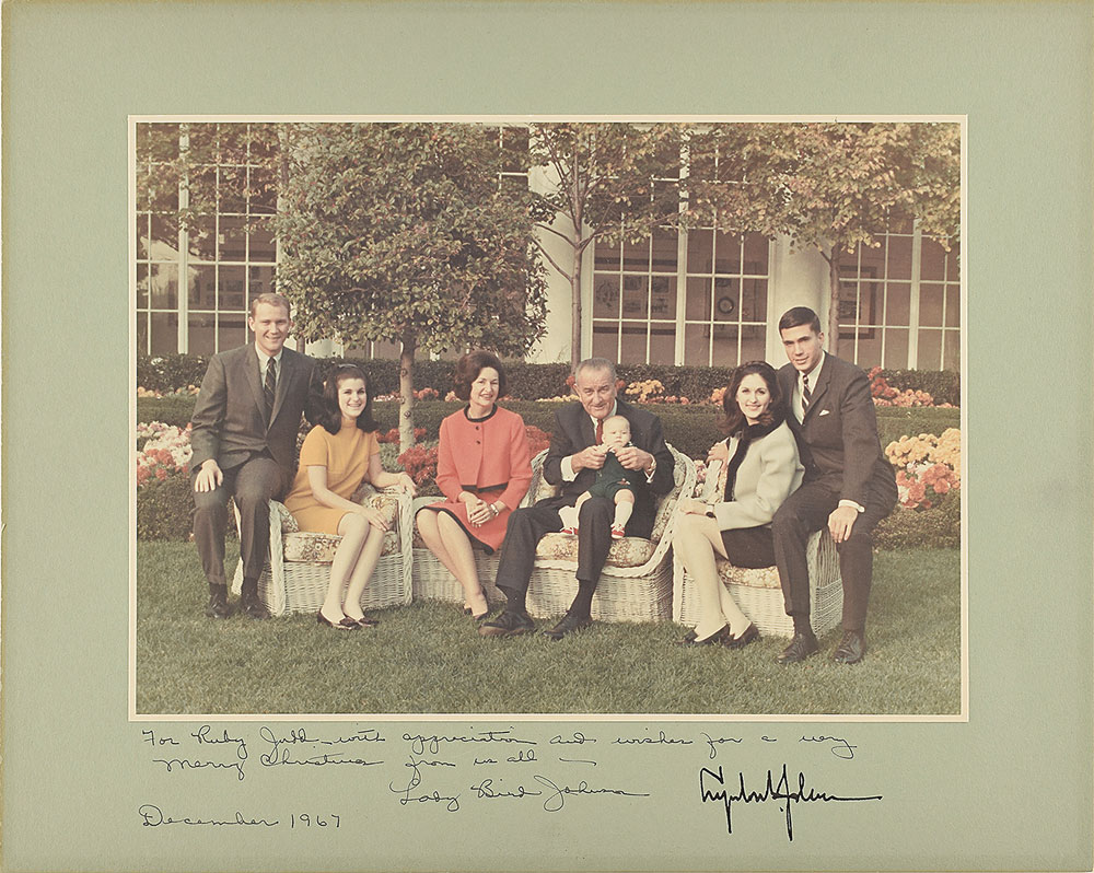 Color glossy 11.5 x 8.25 photo of the Johnson family outside the White House, affixed to its original 15 x 12 mount, signed and inscribed on the mount in black ink, "For Ruby Judd—with appreciation and wishes for a very Merry Christmas from us all—Lady Bird Johnson, December 1967" and "Lyndon B. Johnson.” In fine condition.
