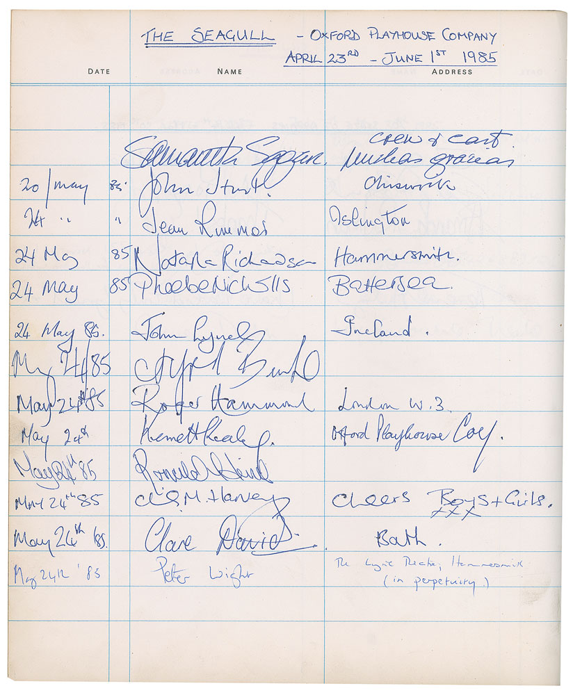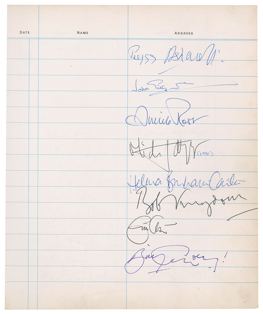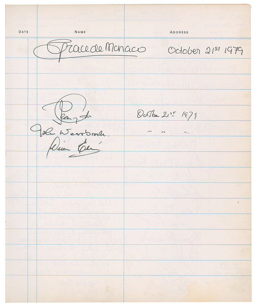 Superb red leather-bound autograph album, 10.5 x 12.5, containing hundreds of signatures from sundry guests, actors, musicians, and dignitaries who attended or performed at the Lyric Theatre in Westminster between 1979 and 2002. The autographs were obtained by Pauline McNally, a stage door receptionist at the theatre for over 20 years. Notable signers include: Queen Elizabeth II and Prince Philip, Prince Edward, Prince Andrew, Princess Margaret, Grace Kelly (as Grace de Monaco), Mick Jagger, Eric Clapton, Brian May, Ryan Adams (who adds a wonderful and rare self-portrait sketch), Judi Dench, John Hurt, Natasha Richardson, Kenneth Branagh, Pete Postlethwaite, Ian McKellen, Simon Callow, Billy Connolly, Bill Nighy, Andy Serkis, Joanna Lumley, Tracey Ullman, Helena Bonham Carter, Robbie Coltrane, Brian Glover, Dennis Waterman, Rupert Everett, Tom Courtenay, Amanda Redman, Rula Lenska, Peggy Ashcroft, Barbara Windsor, Richard Briers, and many more. In fine condition. A legitimate treasure trove of theatre and celebrity autographs.