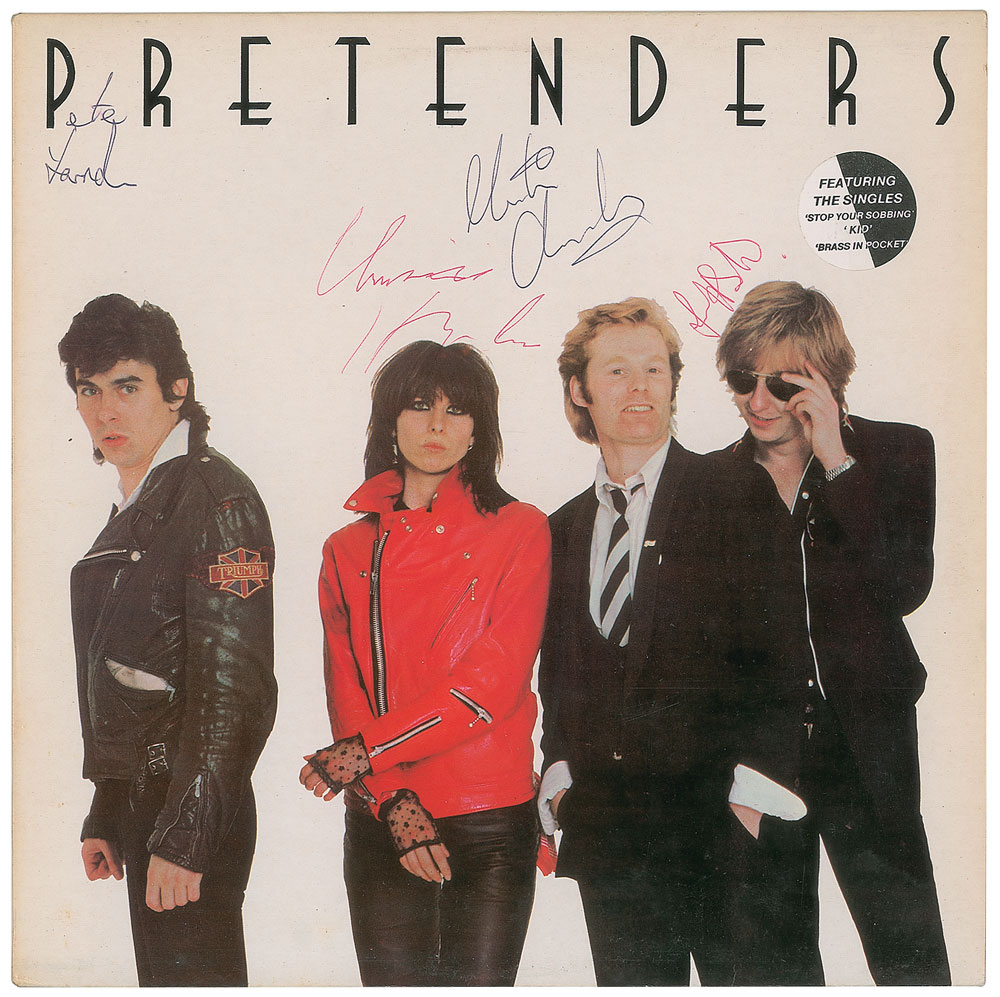 Self-titled debut album by The Pretenders, signed on the front cover in red ballpoint by Chrissie Hynde and James Honeyman-Scott, and in black ballpoint by Martin Chambers and Pete Farndon. In fine condition. The record is not included.