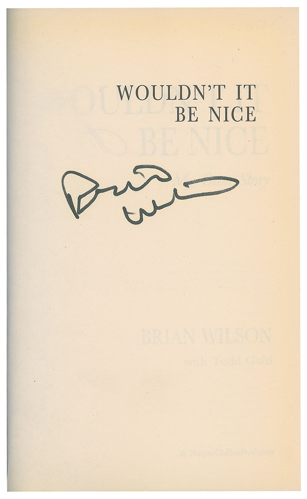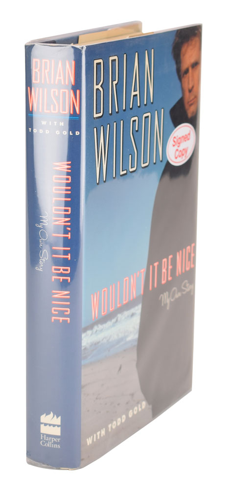 Three items: a first edition of Wouldn't It Be Nice, hardcover with dust jacket, signed on the half-title page in black felt tip by Brian Wilson; and two felt tip signatures on individual white 6 x 4 cards, each encapsulated in a PSA/DNA authentication holder. In overall fine condition.