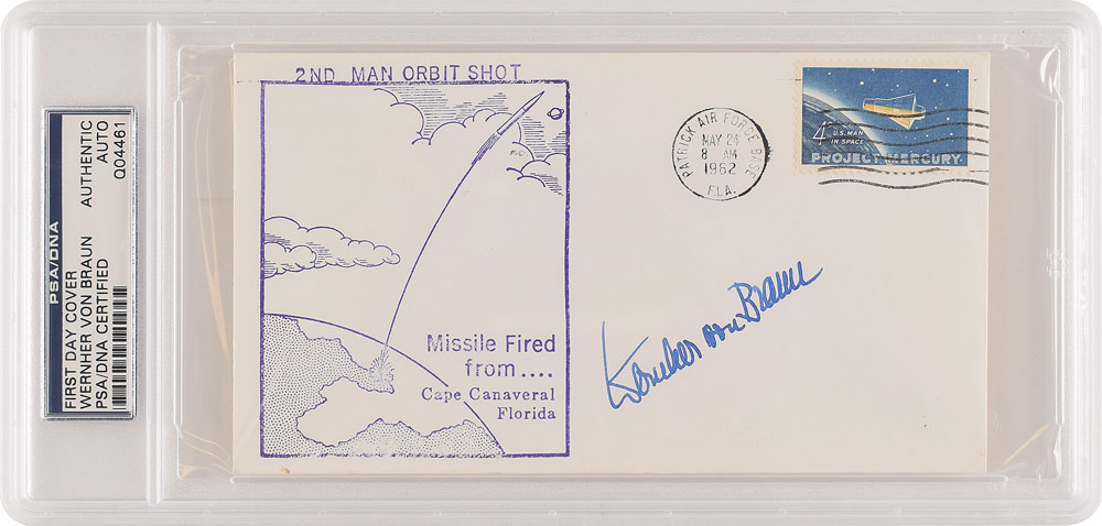 Launch day cover with a cachet honoring the 'manned orbit shot' of Scott Carpenter's Aurora 7 capsule, postmarked on the launch date on May 24, 1962, signed in fountain pen, "Wernher von Braun." In very fine condition. Encapsulated in a PSA/DNA authentication holder.