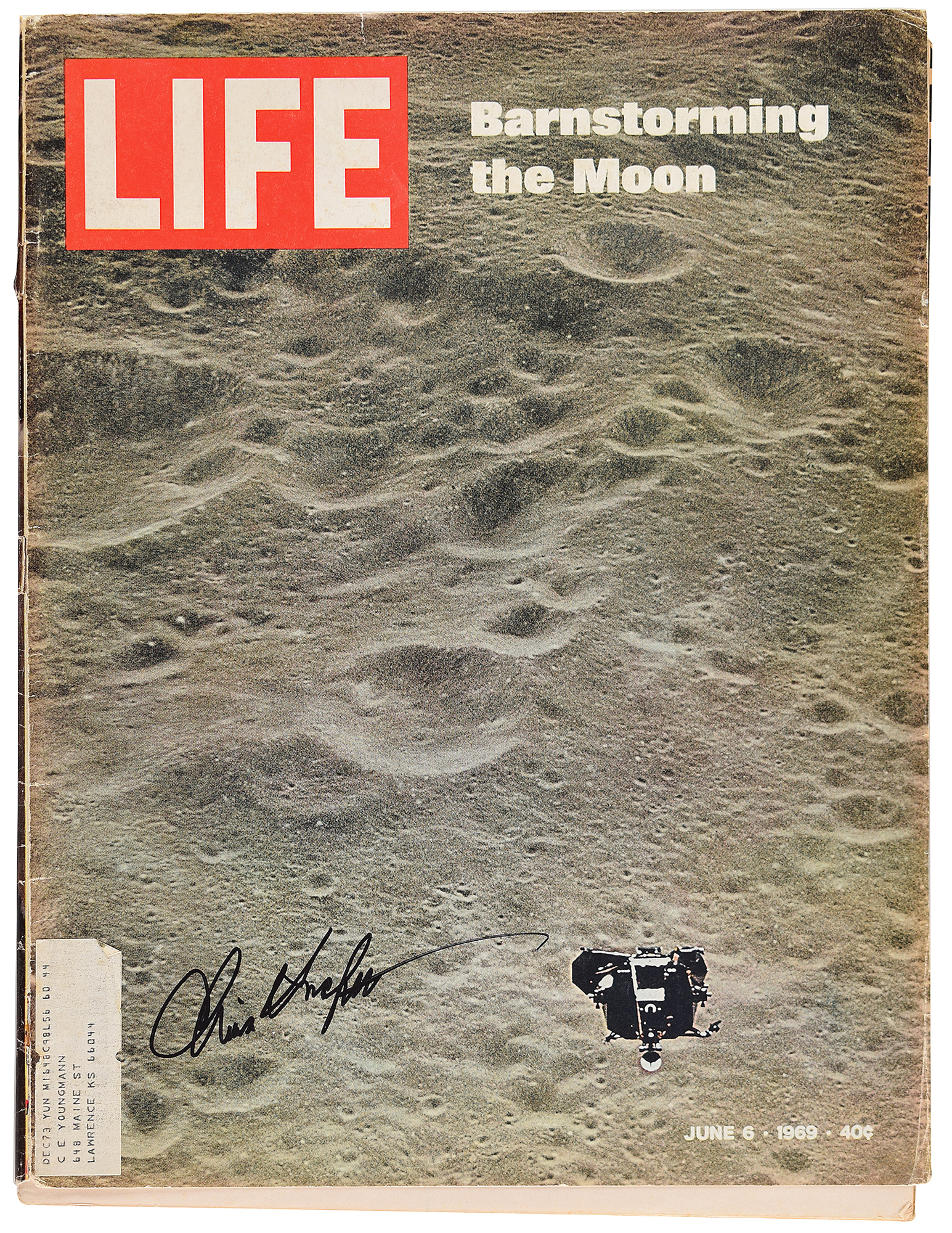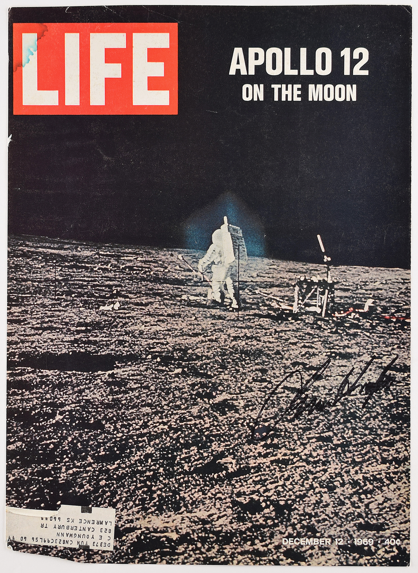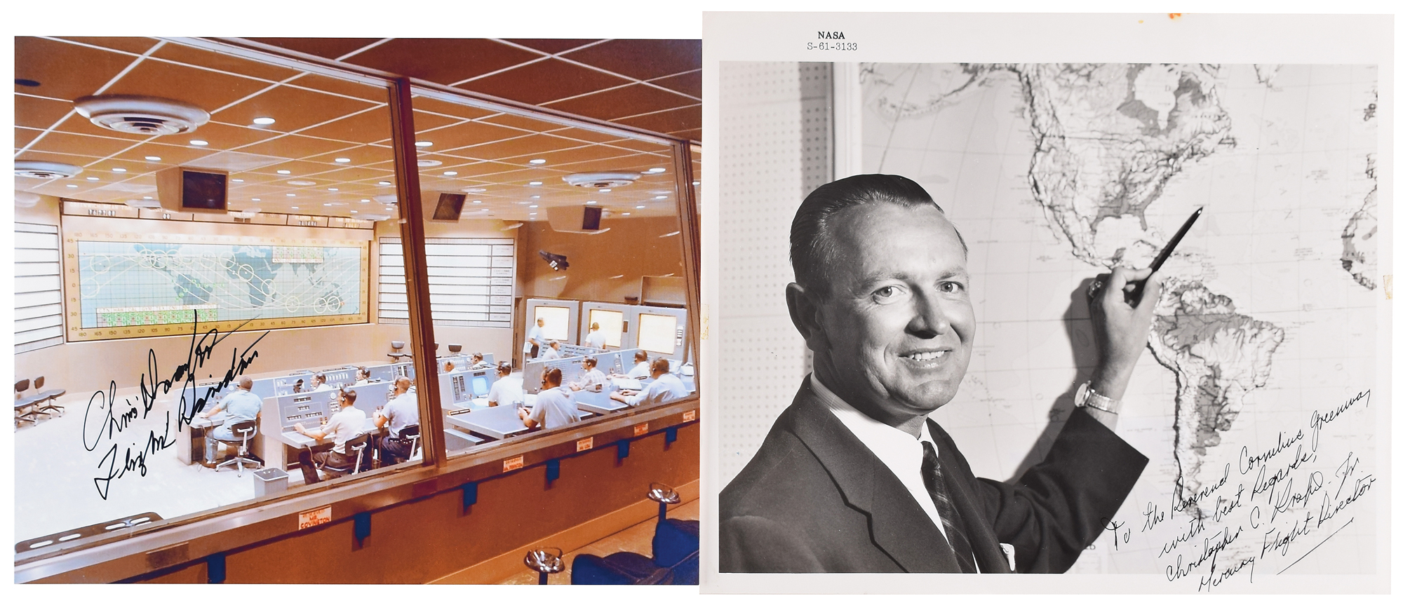 Four items: color glossy 10 x 8 photo of Mission Control, signed in in black felt tip, "Chris Kraft, Flight Director"; official glossy 10 x 8 black-numbered NASA photo, signed and inscribed in ink, "To the Reverend Cornelius Greenway, with best regards, Christopher C. Kraft, Jr., Mercury Flight Director"; the front cover of Life Magazine from December 12, 1969, depicting the Apollo 12 lunar landing, signed in black felt tip, "Chris Kraft"; and an issue of Life Magazine from June 6, 1969, signed on the front cover in black felt tip, "Chris Kraft." In overall very good to fine condition.