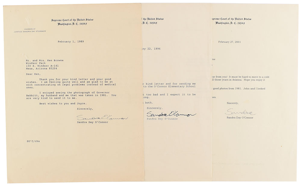 Four letters: three TLSs, signed "Sandra" and "Sandra O'Connor," each one page, 8.5 x 11, Supreme Court letterhead, dated from 1989-2001. O'Connor writes to Ken Browne, in part: "I am feeling quite well and am glad to be at work concentrating on legal problems instead of medical ones," "My shoulder is not too bad and I expect it to be fully recovered before too long," and "It must be hard to move to a cold wintry climate after all those years in Arizona. Hope you enjoy it nonetheless"; and an ALS signed "Sandra O'Connor," one page, 6.25 x 8.5, Supreme Court letterhead, in part: "The photos are wonderful. I am so pleased to have them in remembrance of my big day in Arizona. Thank you!"