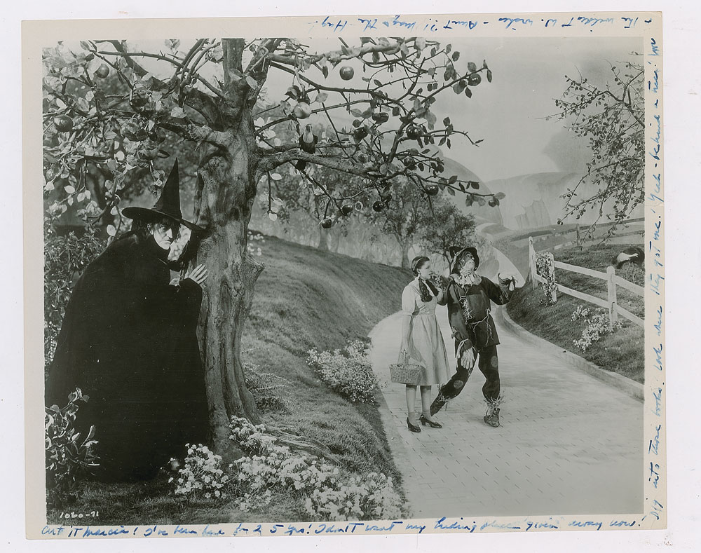 Glossy 10 x 8 photo of the Wicked Witch of the West spying on Dorothy and the Scarecrow as they walk down the yellow brick road, playfully signed and inscribed around the borders in fountain pen, "Cut it Marcia! I've been here for 25 years! I don't want my hiding place given away now! Dig into those books! Look where they got me! Yeah—behind a tree! Love—the wildest W. wishes—Aunt?! Mag the Hag!” In very good to fine condition, with scattered creasing, a short tear to the right edge, and some light brushing to the ink.