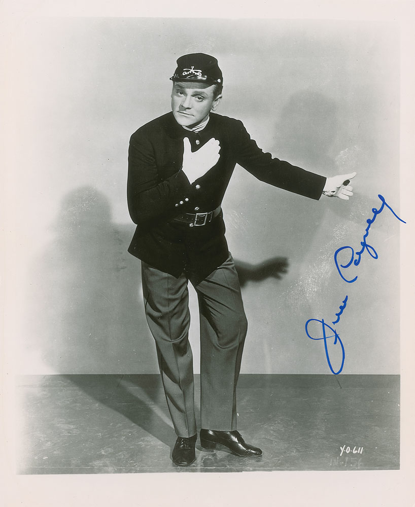 Glossy 8 x 10 photo of Cagney in costume as a soldier, signed in blue felt tip, "Jim Cagney." In fine condition.