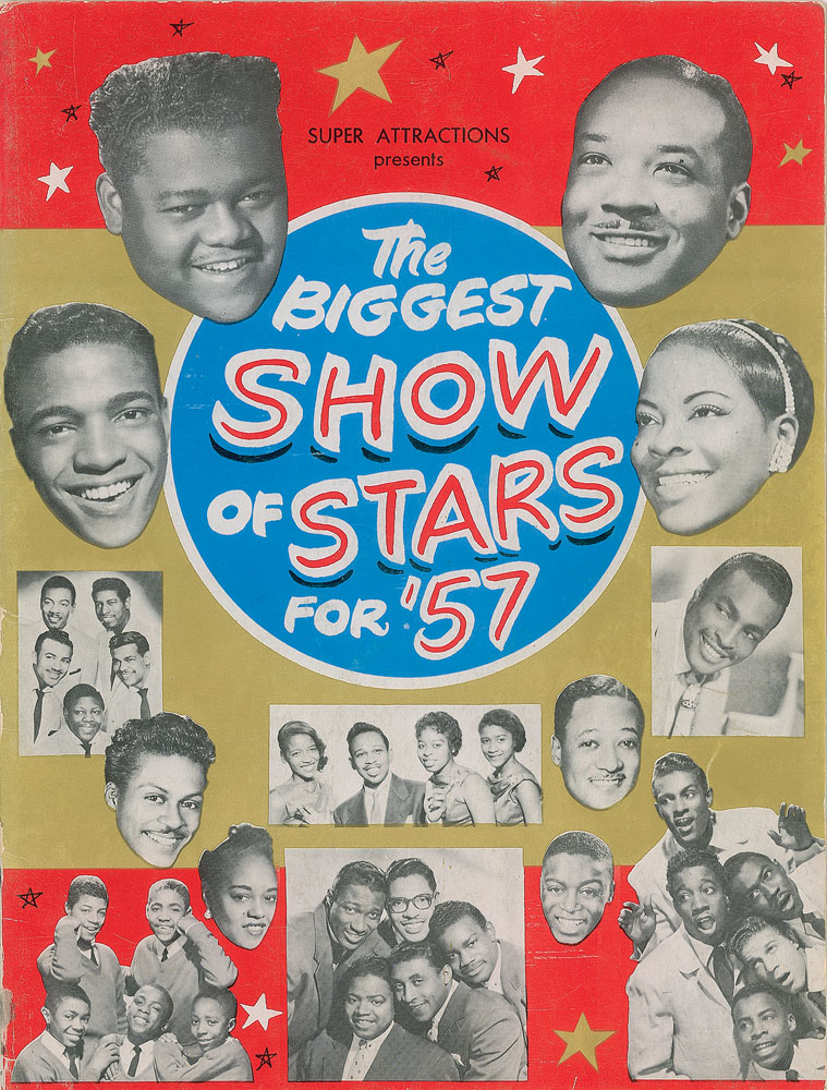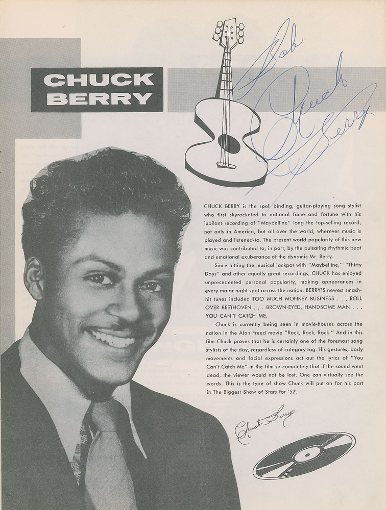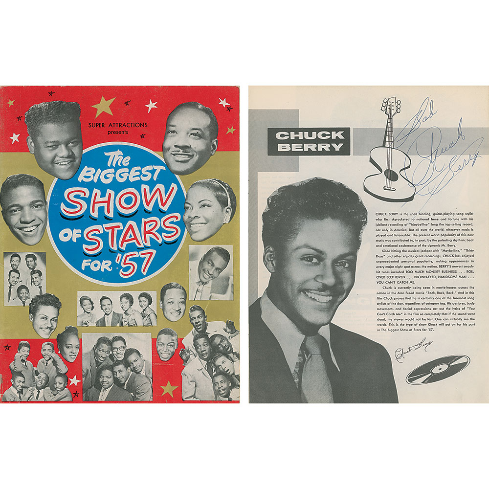 Program for "The Biggest Show of Stars for '57," 24 pages, 9 x 12, signed and inscribed inside in blue ballpoint by Chuck Berry, Ripley Ingram, Bernard West, Bill Doggett, Billy Johnson, Paul Williams, and a few others. In fine condition.