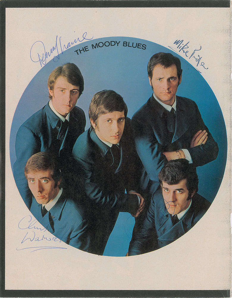Color vintage 8.5 x 11 paperstock program photo of The Moody Blues, signed in blue ink by Mike Pinder, Ray Thomas, Denny Laine, and Clint Warwick. In fine condition.