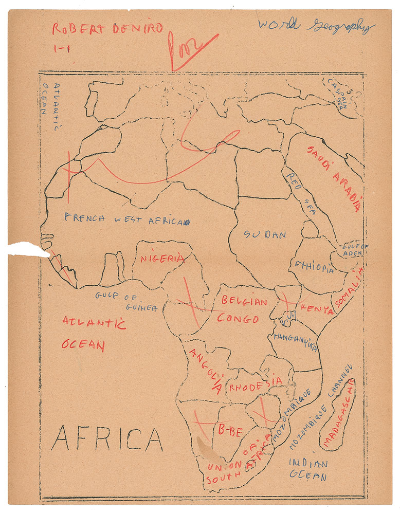 Homework for "World Geography" filled out in ballpoint and red pencil by the young Robert DeNiro, one page, 8.5 x 11, signed at the top, "Robert DeNiro." DeNiro fills out a map of Africa, identifying nations and bodies of water including "French West Africa," "Sudan," "Ethiopia," "Tanganyika," "Atlantic Ocean," "gulf of Guinea," "Mozombique," and the "Red Sea" in ballpoint, and adding "Saudi Arabis," "Nigeria," "Belgian Congo," "Rhodesia," "Union of South Africa," "Madagascar," and others in red pencil. At the top, his teacher has marked the assignment as "Poor." In very good to fine condition, with a central horizontal fold, and a tear and accompanying loss to the left edge.