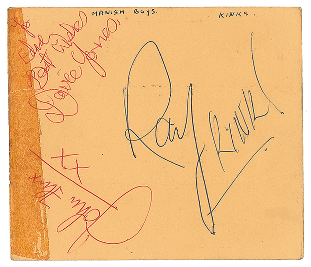Vintage ballpoint signature by Bowie early in his career as a member of the Manish Boys, "To Edna, Best Wishes, David Jones,” on a beige 4.5 x 4 album page, also signed by Ray Davies of the Kinks and one other. In very good to fine condition, with an old tape stain impinging on Bowie's signature and inscription.