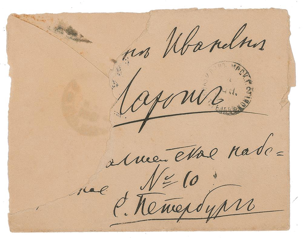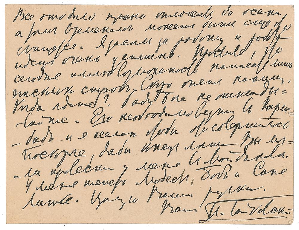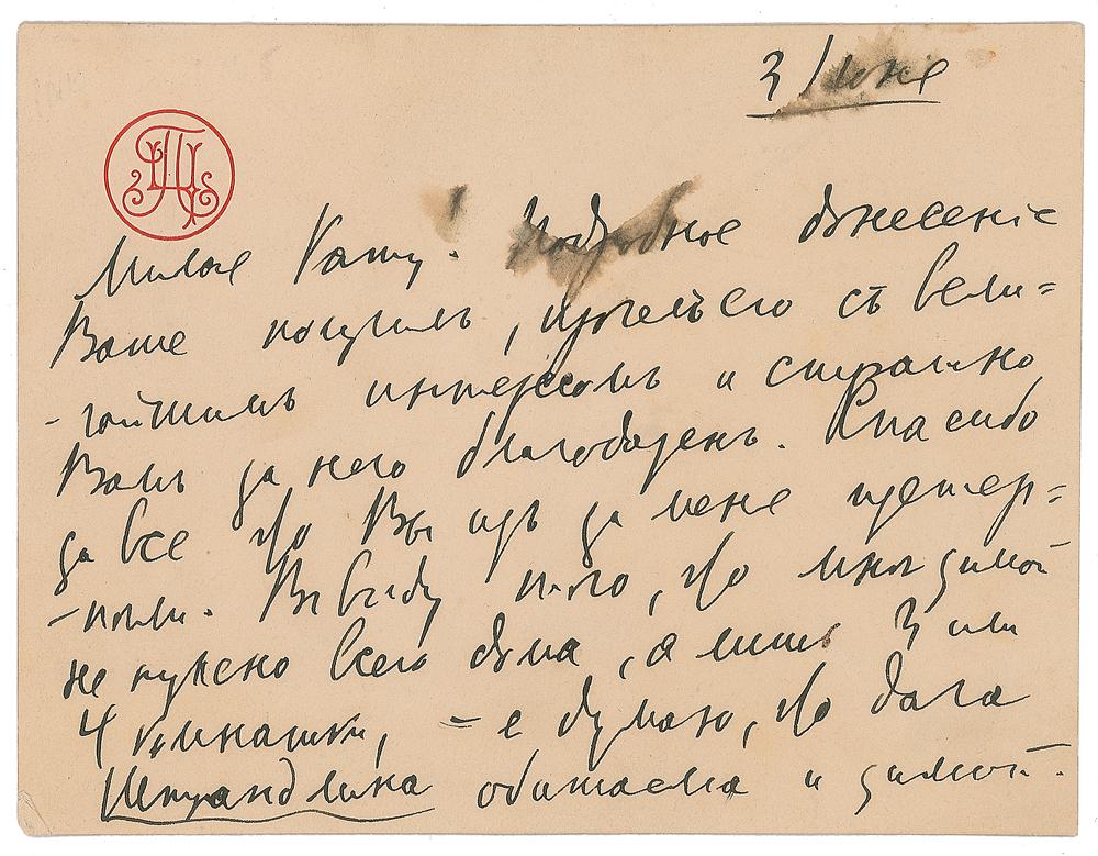 ALS in Cyrillic, signed “P. Tchaikovsky,” one page both sides, 4.5 x 3.5, personal monogram letterhead, June 3/15, [1891]. Letter to Ekaterina Ivanova Laroche, third wife of his old friend Herman Laroche, and the dedicatee of one of the Opus 72 piano pieces. In full (translated): "Dear Katu! I received your thorough report, which I read with great interest and for which I am terribly grateful to you. Thank you for everything you had to endure on my account. Bearing in mind that I do not need a whole house for the winter, but just 3 or 4 rooms, I think that Strandman's dacha would still be habitable for the winter. All these matters can be put off until the autumn, and something else might well have turned up by then. I have sat down to work, and my work is coming along very successfully. Forgive me that it is only possible to write a few lines today. I will write again soon When are you leaving? For God's sake do not put it off. He must be taken to Karlsbad without delay, and I hope this can be done with the utmost haste, so that you can spend the end of the summer with me at Maydanovo. At present I have Modest, Bob, and Sania Litke with me." In fine condition, with smudging to a couple of words of text. Accompanied by the original mailing envelope addressed in Tchaikovsky's hand.