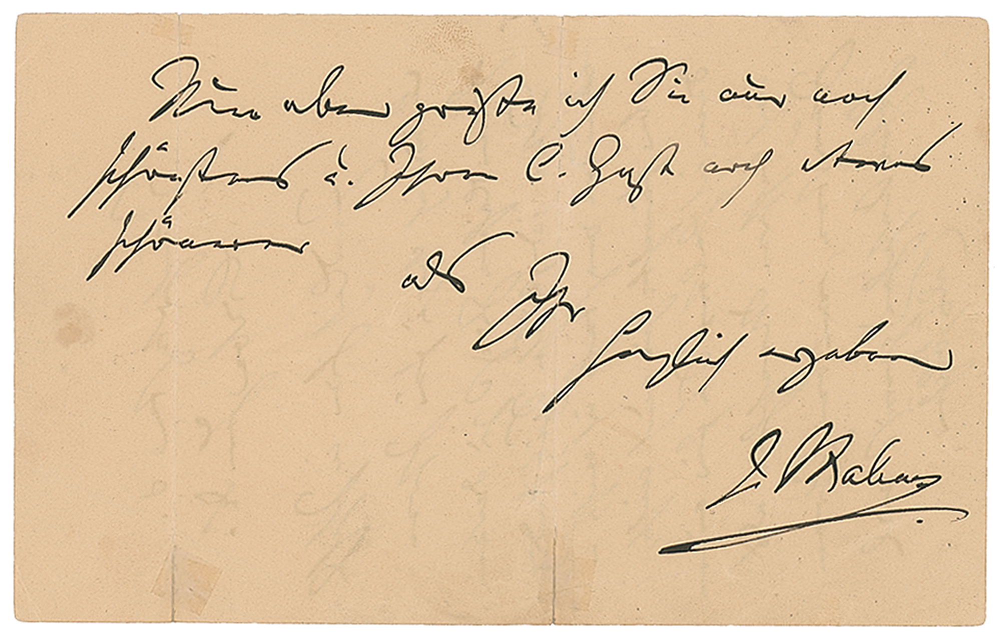 ALS in German, signed “J. Brahms,” one page both sides, 4.25 x 6.75, November 16, 1889 [?]. Letter to Felix Hecht in Mannheim, in part (translated): "Finally here in Ischl I come to thank you for your kind regards. I don't understand your legal subtleties—but I don't fear them either, because I consider you an even better person than a lawyer, which, given your high reputation as such, certainly means a lot. By the way, we are both depicted in the most beautiful way. Just yesterday, something very friendly came to me from Mannheim. A Frankfurt report by W[ilhelm] B[opp] in the new Baden state newspaper. How seldom do you read such things with such serious sympathy and true joy as I have often read the essays by your fellow citizen. But now I greet you most beautifully and your dear guest even more beautifully." In very good to fine condition, with a stain to the top of the first page, and small repairs to fold splits on the second page.