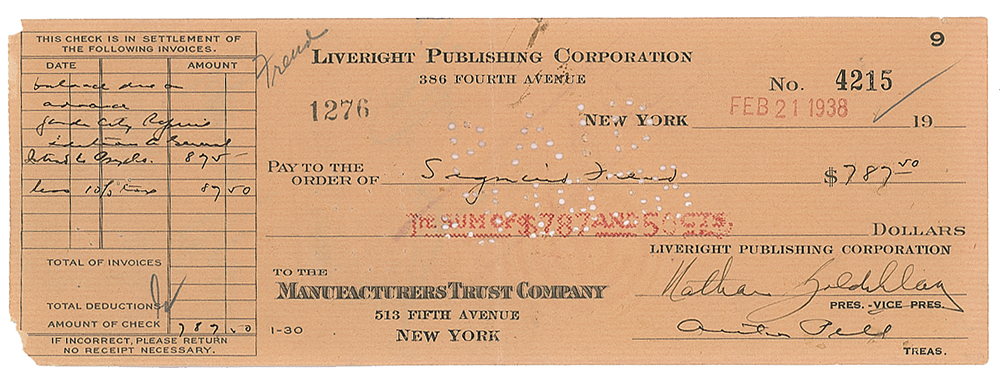 Extremely rare Liveright Publishing Corporation business check, 8.5 x 3, filled out in another hand as payable to Sigmund Freud for $787.50, February 21, 1938, endorsed on the reverse by the famed psychoanalyst, "Sigmund Freud." The memo field notes that the payment is for "balance due on advance, Garden City Reprint edition A General Intod. to Psycho." In fine condition, with a central vertical fold, and trivial loss to two corners.