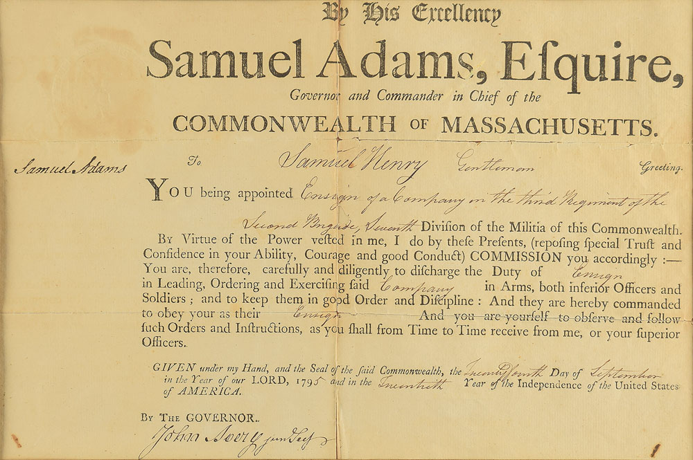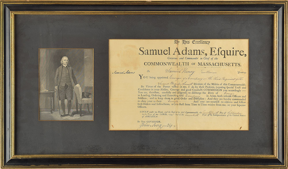 Desirable partly-printed DS, one page, 13.5 x 8.75, September 24, 1795. As governor of Massachusetts, Adams appoints Samuel Henry as "Ensign of a Company in the third Regiment of the Second Brigade, Seventh Division of the Militia of this Commonwealth." Boldly signed in the left margin by Governor Adams and countersigned at the bottom by John Avery. Matted and framed with an engraved portrait to an overall size of 28 x 16.5. In very good to fine condition, with splitting along the intersecting folds. An ideal, bold autograph from the Revolutionary leader.