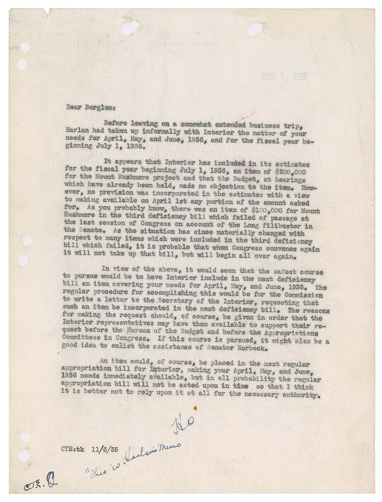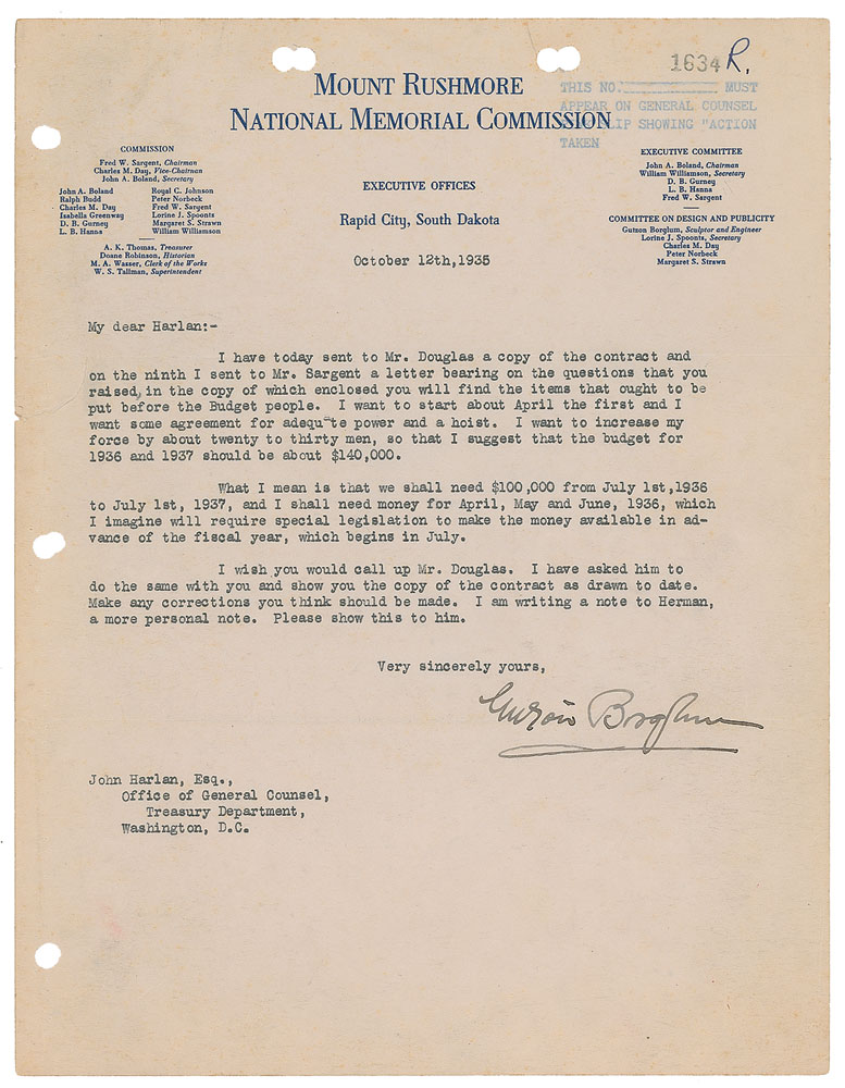 TLS, one page, 8.5 x 11, Mount Rushmore National Memorial Commission letterhead, October 12, 1935. Letter to John Harlan, in part: "On the ninth I sent to Mr. Sargent a letter bearing on the questions that you raised, in the copy of which enclosed you will find the items that ought to be put before the Budget people. I want to start about April the first and I want some agreement for adequate power and a hoist. I want to increase my force by about twenty to thirty men, so that I suggest that the budget for 1936 and 1937 should be about $140,000. What I mean is that we shall need $100,000 from July 1st 1936 to July 1st, 1937, and I shall need money for April, May and June, 1936, which I imagine will require special legislation to make the money available." In very good to fine condition, with several file holes, and a tear to the left edge. Accompanied by the enclosure referenced, a carbon copy of a letter related to the budget for the construction of Mount Rushmore.