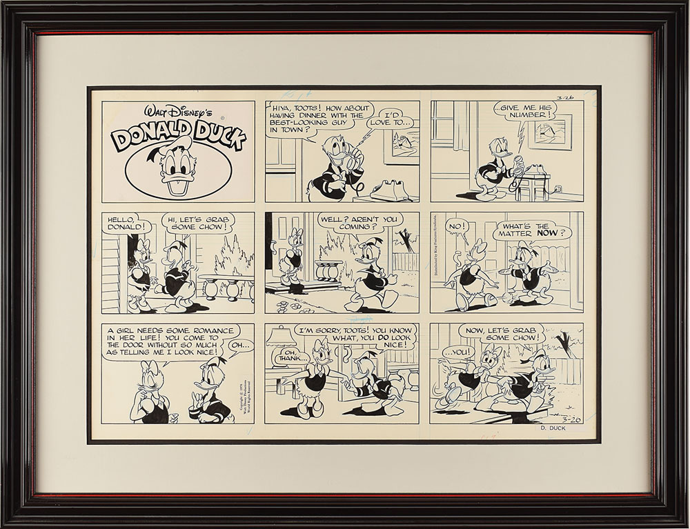 (Walt Disney Productions, 1978) Original hand-inked eight-panel "Walt Disney's Donald Duck" comic strip featuring Donald and Daisy Duck, relating the humorous tale of a dinner-date setup. Accomplished in ink and pencil on a 22 x 15 sheet. Double-matted and framed to an overall size of 29.5 x 22.75. In fine condition.