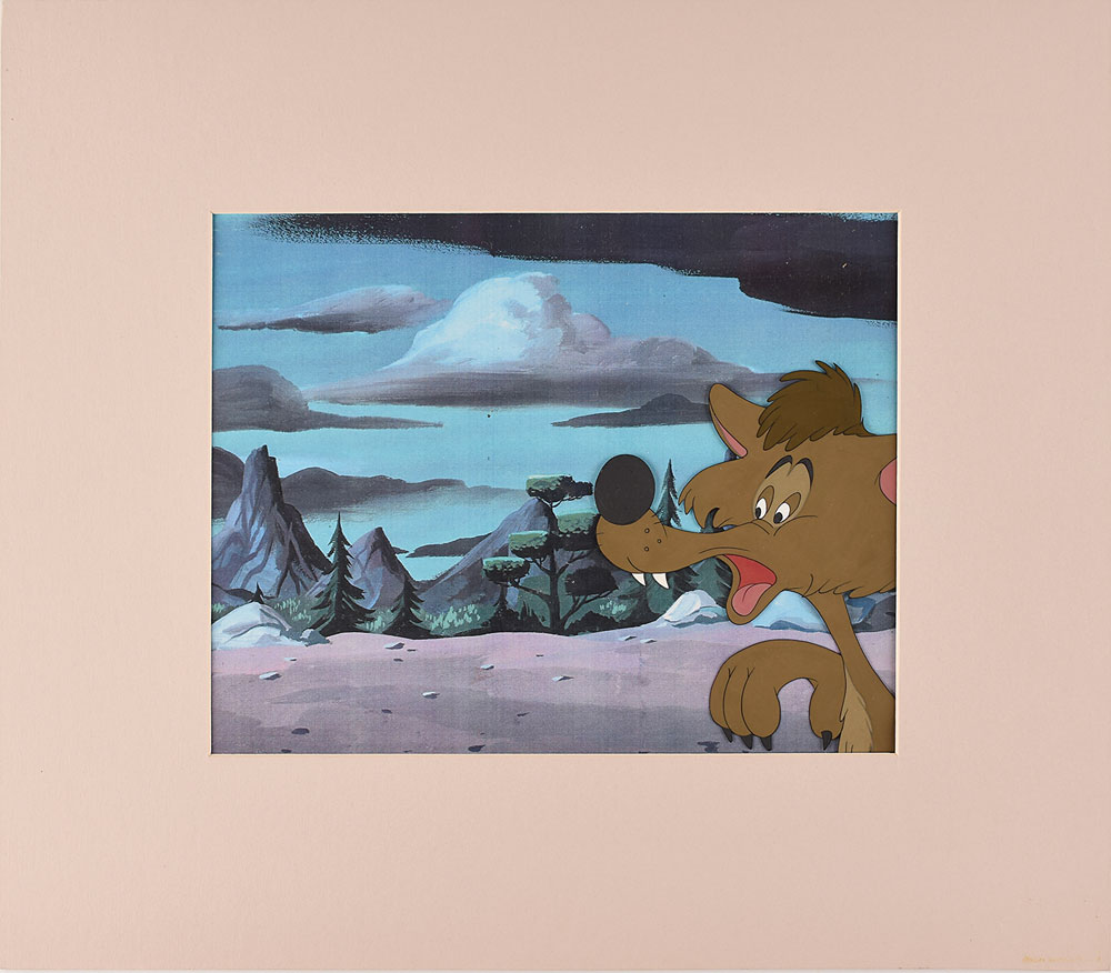 (Walt Disney Studios, circa 1950s) Original production cel featuring Bent-Tail coyote from a Pluto short. The cel is placed on a color copy background. Image measures 6 x 7 underneath the mat, with a mat opening of 9.75 x 7.75. Matted to an overall size of 16 x 13.5. In fine condition, some chipping to paint at the very bottom of the character image. Bent-Tail was a nemesis to Pluto in four theatrical shorts, usually accompanied by his son, Bent-Tail, Jr. A fantastic, large portrayal of this scarce Disney villain.