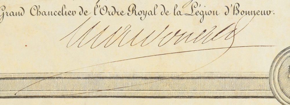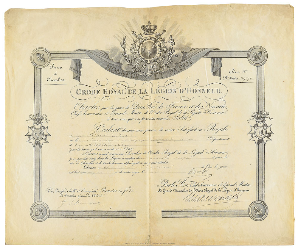 King of France from 1824 to 1830, whose attempt to restore absolute rule led to his overthrow in the July Revolution. Partly-printed vellum DS in French, signed “Charles,” one page, 17.5 x 14.5, February 16, 1826. A Royal Order of the Legion of Honor, (translated) which wishes "to give proof of our royal satisfaction to M. Pochier (Jean-Baptiste), born on January 1st, 1787, in Oudenarde (Holland); Sergeant in the 18th Regiment of the Infantry of the League; for the services that he has rendered to ourselves and the State. We have named and do name him Knight of the Royal Order of the Legion of Honor." Signed at the conclusion by King Charles X. In fine condition, with light creasing to the top edge.