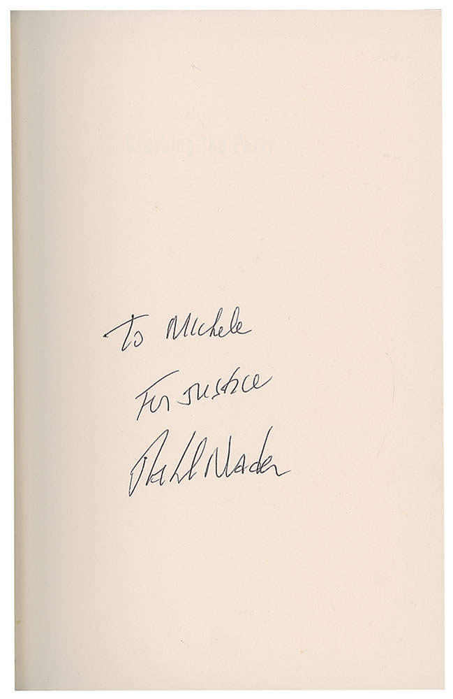 Signed book: Crashing the Party. Later printing. NY: Thomas Dunne Books, 2002. Hardcover with dust jacket, 6.5 x 9.5, 383 pages. Signed and inscribed on the first free end page in black ballpoint, "To Michele, For Justice, Ralph Nader." In fine condition.