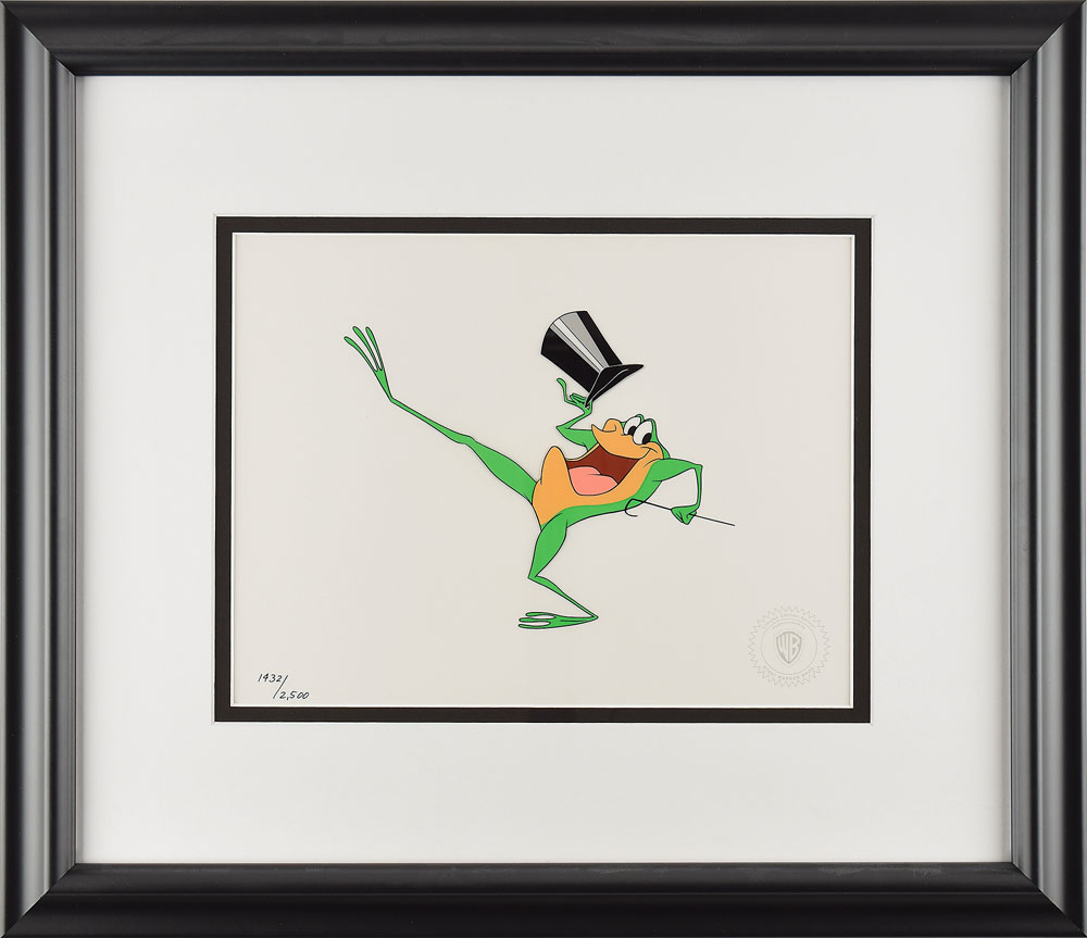 (Warner Brothers Studios, 1992) Limited edition sericel from Warner Bros. Animation entitled 'Michigan J. Frog,' numbered 1432/2500, which depicts the high-stepping and top hat-wearing bullfrog during his 'Hello! Ma Baby' song-and-dance routine. Image measures 8 x 6.5, with a mat opening of 12.5 x 9.5. Double-matted and framed to an overall size of 21.75 x 18.75. The piece has the Warner Bros. seal to lower right. In fine condition. Accompanied by a certificate of authenticity from Warner Bros.