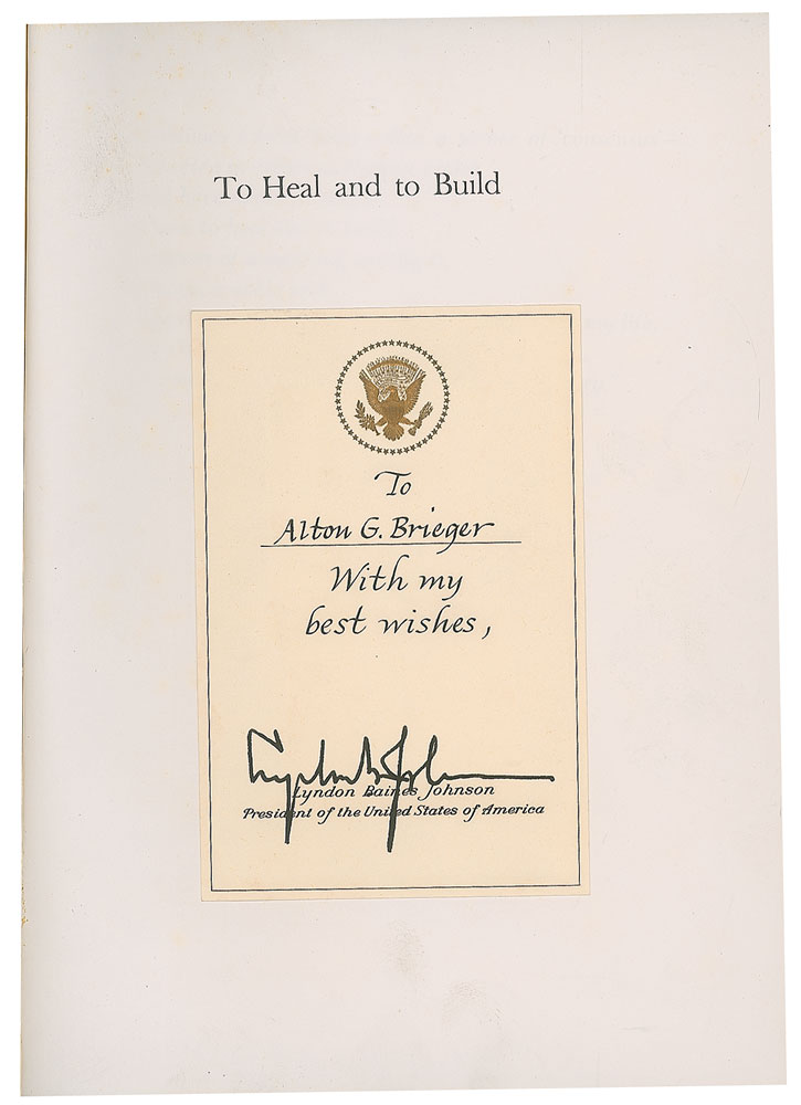 Signed book: To Heal and to Build: The Programs of President Lyndon B. Johnson. Second printing. NY: McGraw-Hill, 1968. Hardcover with dust jacket, 7 x 9.25, 506 pages. Calligraphically inscribed on a bookplate affixed to the half-title page, "To Alton G. Brieger, With my best wishes," and signed below in fountain pen, "Lyndon B. Johnson." In fine condition.