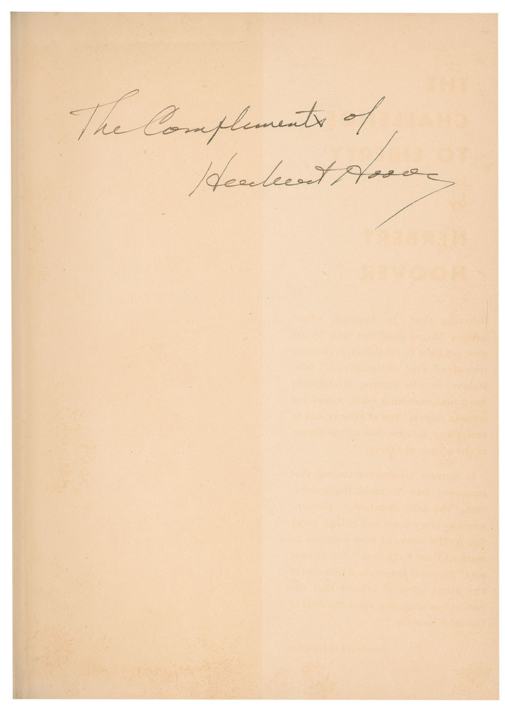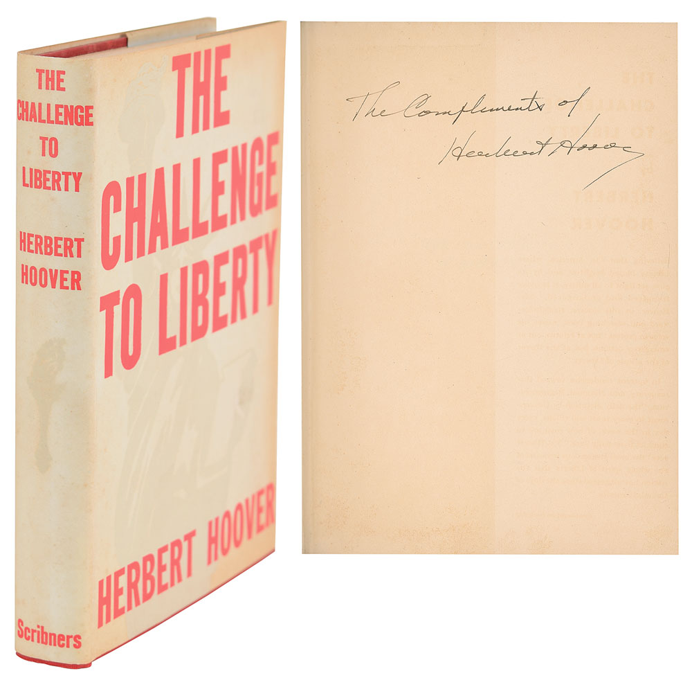 Signed book: The Challenge to Liberty. Third large printing. NY: Charles Scribner's Sons, 1935. Hardcover with dust jacket, 5.75 x 8, 212 pages. Signed neatly on the first free end page in black ink, "The compliments of Herbert Hoover." In fine condition, with light toning to the signed page, and to the dust jacket.