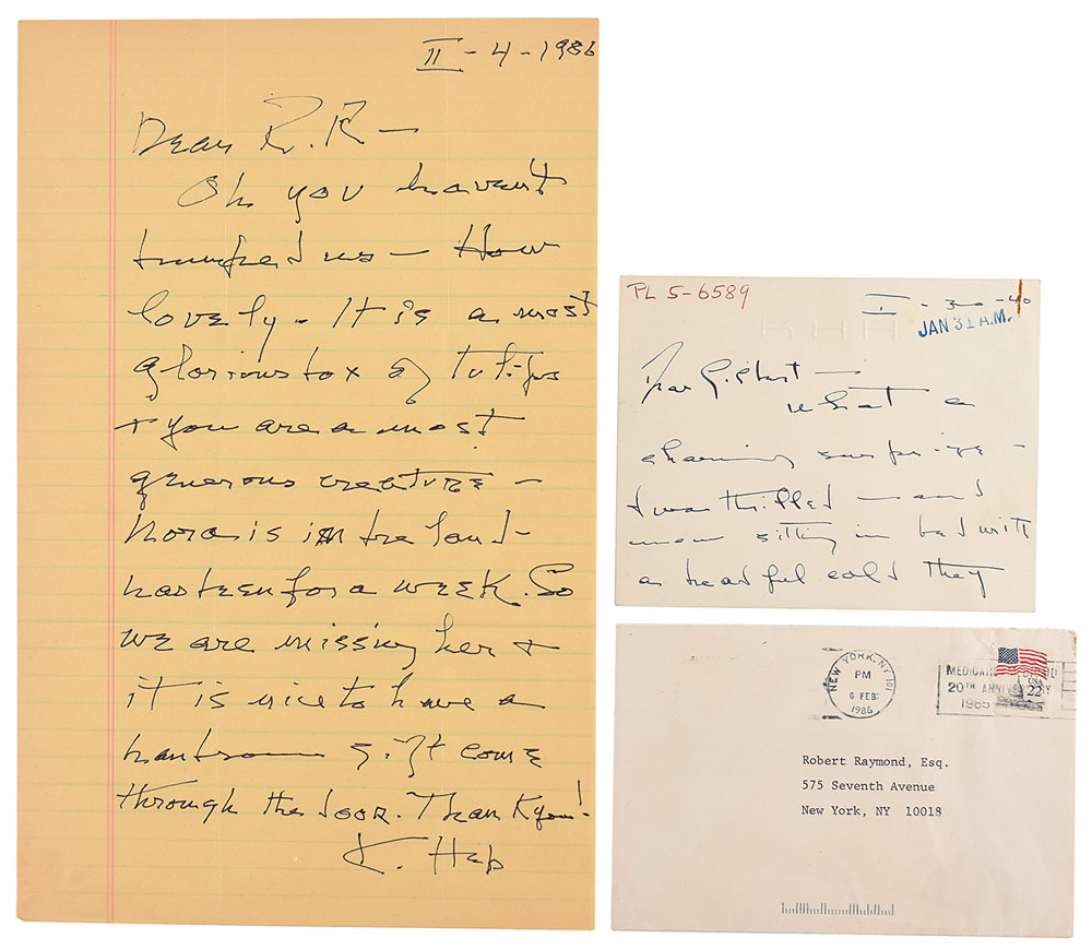 Two ALSs: one signed "Katharine Hepburn" on both sides of a 5.5 x 4.5 stationery card, January 30, 1940, in part: "What a charming surprise—I was thrilled—and now sitting in bed with a dreadful cold—they are my only sources of joy"; and one signed "K. Hep" on a yellow 8 x 12.5 lined sheet, February 4, 1986, in part: "How lovely—it is a most glorious box of tulips & you are a most generous creature." In overall fine condition. Accompanied by the original mailing envelope for the 1986 letter, and two full letters of authenticity from Beckett Authentication Services.