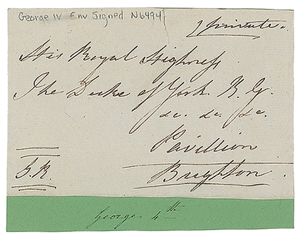 Hand-addressed and free-franked mailing panel, 4.75 x 3, addressed by George to "His Royal Highness The Duke of York R. G., Pavillion, Brighton," and franked in the lower left corner, "G. R." Affixed to a slightly larger sheet and in fine condition. From the collection of Dr. Lawrence E. Miller. From the collection of Dr. Lawrence E. Miller.