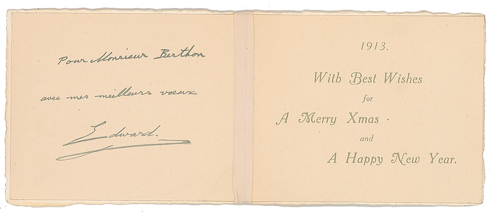 Christmas card from 1913, measuring 9 x 3.5 open, signed and inscribed opposite the printed message in ink, "Pour Monsieur Berthon, avec mes meilleurs voeux, Edward." In fine condition, with light staining to the front cover. From the collection of Dr. Lawrence E. Miller. From the collection of Dr. Lawrence E. Miller.