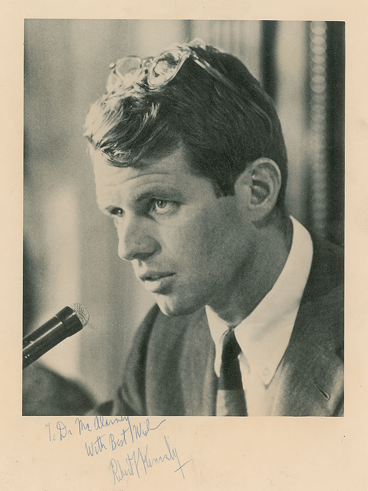 Vintage matte-finish 7.5 x 10 close-up photo of RFK speaking, signed and inscribed in the lower border in blue ballpoint, "To Dr. McAlarney, With Best Wishes, Robert F. Kennedy.” In fine condition, with light edge rippling, and old adhesive residue on the reverse.