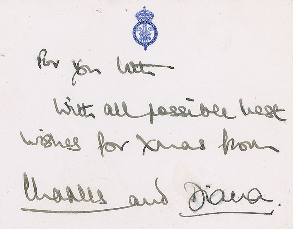 Uncommon fountain pen signatures, "For you both, with all possible best wishes for Xmas from Charles and" and "Diana," on an off-white 4.75 x 3.75 card embossed with the Prince of Wales’s feathers and Order of the Garter motto. In very good to fine condition, with staple holes to the top edge, a tiny tear to the left edge, and light smudging to Diana's signature.