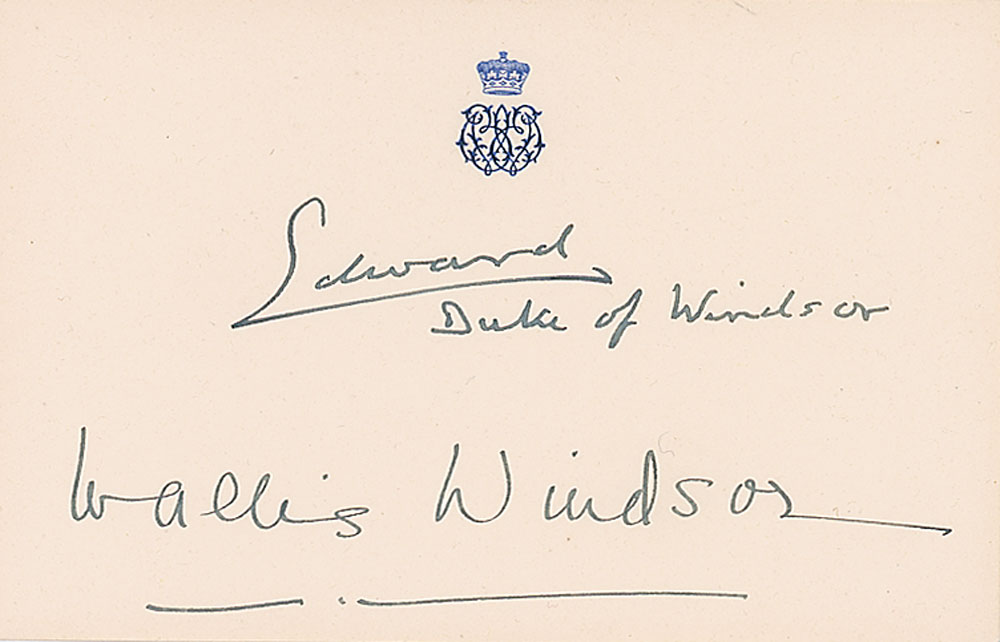 Fountain pen signatures, "Edward, Duke of Windsor" and "Wallis Windsor,” on an off-white 5.5 x 3.5 stationery card bearing the Royal monogram of the Duke and Duchess of Windsor. In very fine condition.