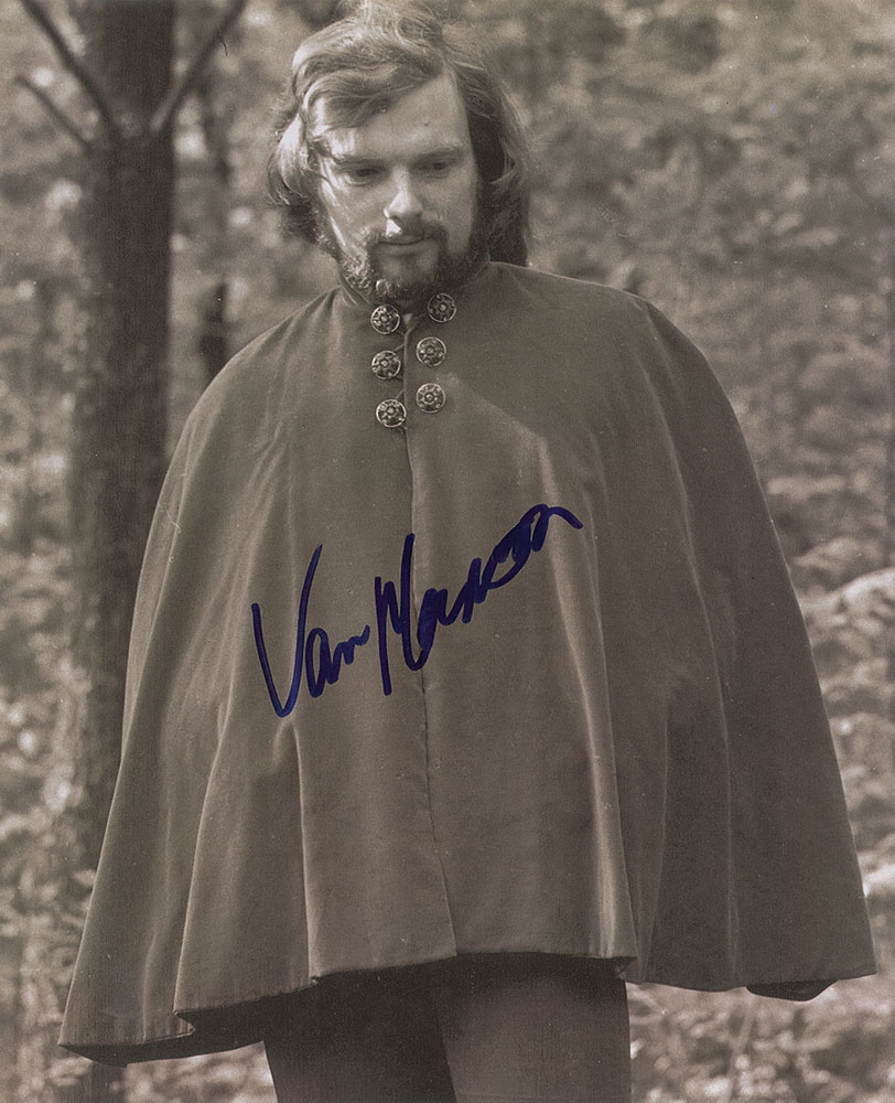 Nice 9.5 x 12 book photo of Van Morrison in the woods wearing a cape, signed in blue felt tip. In fine condition.