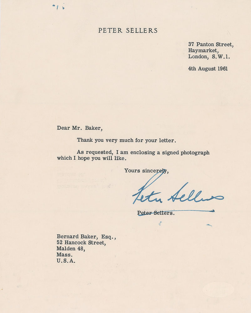 Two items: a TLS, one page, 8 x 10, personal letterhead, August 4, 1961, in full: "Thank you very much for your letter. As requested, I am enclosing a signed photograph which I hope you will like"; and a pearl-finish 3.5 x 5.5 close-up photo of Sellers, signed below in fountain pen. In overall very good to fine condition, with a paperclip impression and postal impression to the photo, and show-through in the lower right corner of the letter from a JSA sticker on the reverse (certificate not present).