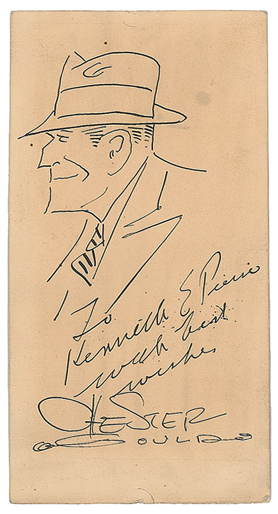 Vintage original sketch of police detective Dick Tracy in profile, accomplished in ink on an off-white 3 x 5.75 card, signed and inscribed below, "To Kenneth E. Pierre, with best wishes, Chester Gould." In very good to fine condition, with slightly irregular light toning, and some old mounting remnants on the reverse.