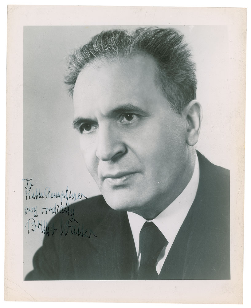 German-born conductor and composer (1876-1962). Vintage glossy 8 x 10 photo of Bruno Walter, signed and inscribed in fountain pen, "To Ruth Gempliner, very cordially, Bruno Walter.” In very good to fine condition, with scattered creasing, a very short edge tear, and three paperclip impressions to the top edge.