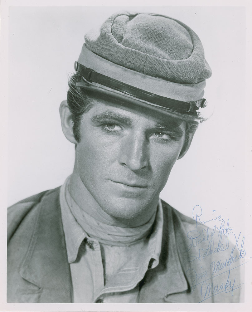 American actor (1931-1981) best known for his recurring role in the Western series Rawhide. Vintage glossy 8 x 10 photo of James Murdock as Mushy from Rawhide, signed and inscribed in blue ballpoint, "Bonnie, Best of life & luck, Jim Murdock, Mushy, x.” Collector's notation on reverse dates the autograph to August 25, 1961. In fine condition, with a few small surface creases. Murdock's signature is rare in any format, this being the first example we have ever offered.
