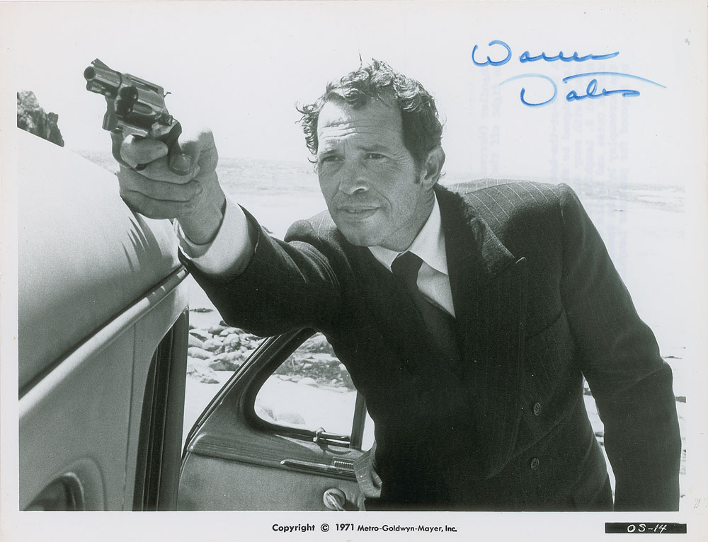American actor (1928-1982) whose roles in the 1970s, notably in films by Sam Peckinpah, have since earned him a strong cult following. Glossy 10.25 x 7.75 MGM publicity photo of Warren Oates as the title character from the 1971 neo-noir film Chandler, signed in blue felt tip. In fine condition. Accompanied by a certificate of authenticity from PSA/DNA.