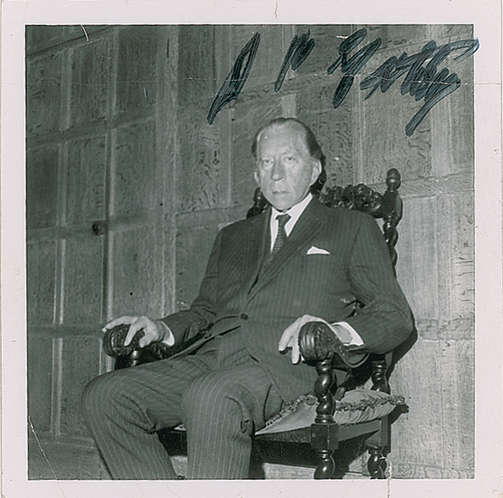 American industrialist, billionaire, and patriarch of the Getty family (1892-1976) who at one time was considered the world's richest private citizen. Glossy 3.5 x 3.5 photo of J. Paul Getty seated in a large wooden chair, signed in black felt tip, "J. P. Getty." In very good condition, with a paperclip impression to the top edge, and several creases, one passing horizontally through the signature.