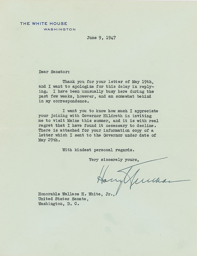 TLS as president, one page, 7 x 8.75, White House letterhead, June 9, 1947. Letter to Senate Majority Leader Wallace H. White, Jr. of Maine, in full: "Thank you for your letter of May 19th, and I want to apologize for this delay in replying. I have been unusually busy here during the past few weeks, however, and am somewhat behind in my correspondence. I want you to know how much I appreciate your joining with Governor Hildreth in inviting me to visit Maine this summer, and it is with real regret that I have found it necessary to decline. There is attached for your information copy of a letter which I sent to the Governor under date of May 29th. With kindest personal regards." In fine condition. Accompanied by the original mailing envelope.