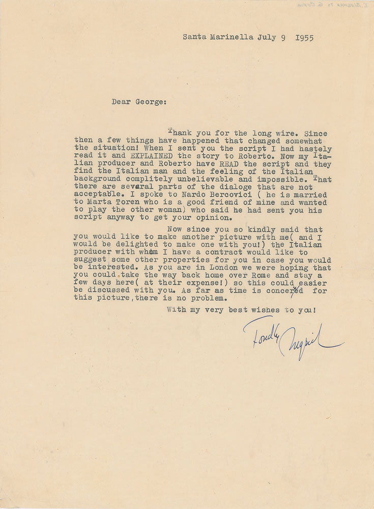 TLS signed “Fondly, Ingrid,” one page, 8 x 11, July 9, 1955. Letter to director George Cukor, in part: "When I sent you the script I had hastely read it and EXPLAINED the story to Roberto. Now my Italian producer and Roberto have READ the script and they find the Italian man and the feeling of the Italian background complitely unbelievable and impossible. That there are several parts of the dialoge that are not acceptable. I spoke to Nardo Bercovici (he is married to Marta Toren who is a good friend of mine and wanted to play the other woman) who said he had sent you his script anyway to get your opinion. Now since you so kindly said that you would like to make another picture with me (and I would be delighted to make one with you!) the Italian producer with whom I have a contract would like to suggest some other properties for you in case you would be interested." In fine condition.