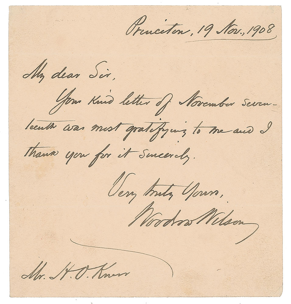 ALS, 5.25 x 5.75, November 19, 1908. Letter to Mr. H. O. Knerr, written from Princeton, in full: "Your kind letter of November seventeenth was most gratifying to me and I thank you for it sincerely." In fine condition, with trimmed edges. Accompanied by an unsigned Harris & Ewing portrait.