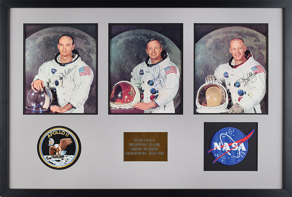 Magnificent display of three official color NASA lithographs, each approximately 7.25 x 9, individually signed in blue or black felt tip by a crew member of the legendary Apollo 11 mission: "M. Collins," "Neil Armstrong," and "Buzz Aldrin." Attractively double-matted and framed with an engraved plaque and embroidered Apollo 11 and NASA 'meatball' patches to an overall size of 30 x 20.25. In overall fine to very fine condition.