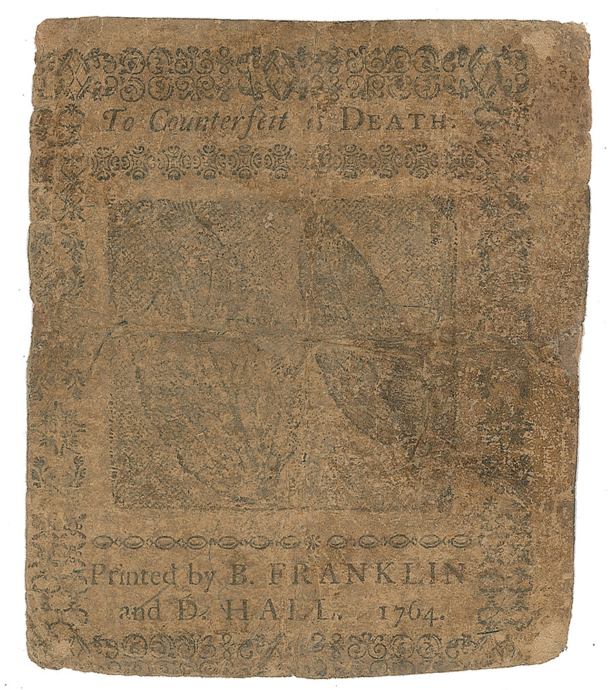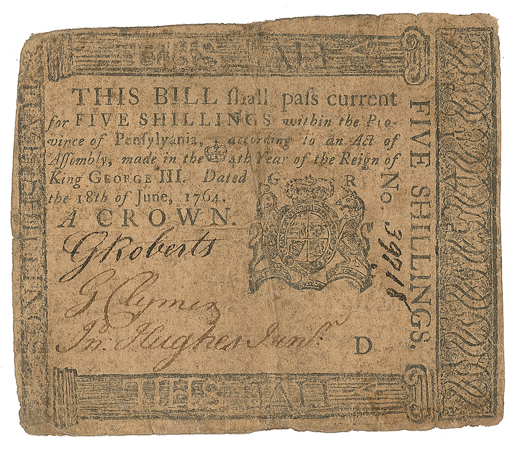 Signer of the Declaration of Independence from Pennsylvania (1739-1813) who served as the first president of the Philadelphia Bank. Rare Colonial Pennsylvania engraved bank note for "Five Shillings," signed “G. Clymer,” 3.5 x 3, issued as No. 39718, and reading: “This Bill shall pass current for five shillings within the Province of Pennsylvania, according to an Act of Assembly, made in the 4th Year of the Reign of King George III. Dated the 18th of June, 1764." Signed at the conclusion by George Clymer. Printed by B. Franklin and D. Hall, with reverse bearing the cautionary message: "To Counterfeit is Death." In very good condition, with overall wear and intersecting folds. From the Collection of Dr. Lawrence E. Miller.