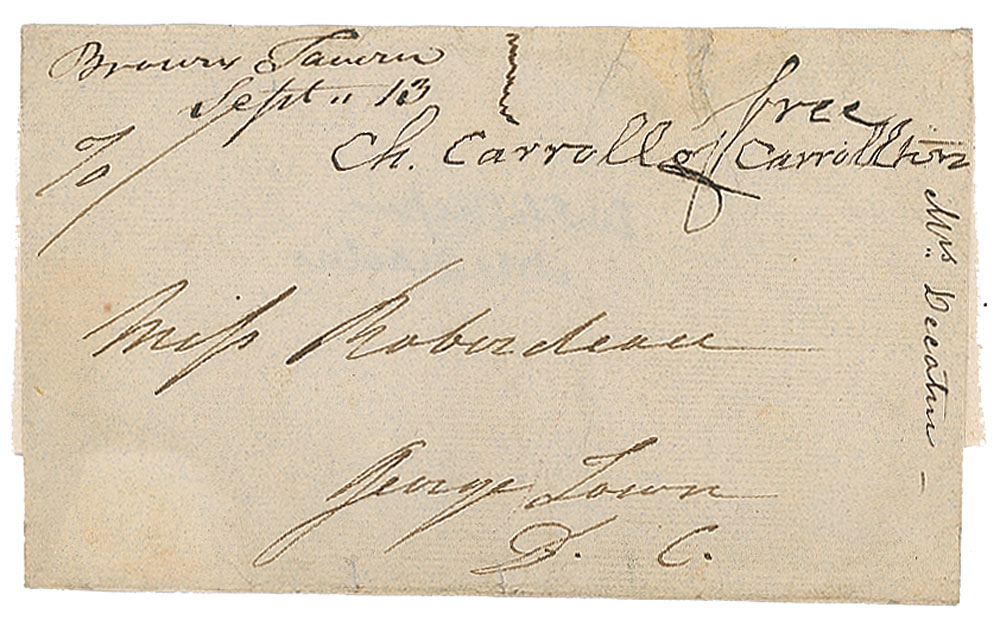 Signer of the Declaration of Independence from Maryland (1737-1832) who was the longest-lived among his colleagues. Free-franked mailing panel, 5 x 3, addressed in another hand to "Miss Roberdeau, George Town, D.C.," and franked at the top, "Free, Ch. Carroll of Carrollton." Dated at Brown Tavern, September 13th. In fine condition. From the Collection of Dr. Lawrence E. Miller.