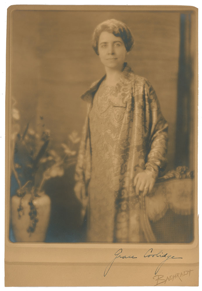 Attractive vintage sepia matte-finish 7.25 x 10.75 Bachrach photo of Coolidge in a three-quarter-length pose, signed in the lower border in fountain pen, "Grace Coolidge." In fine condition, with trimmed edges. From the Collection of Dr. Lawrence E. Miller.